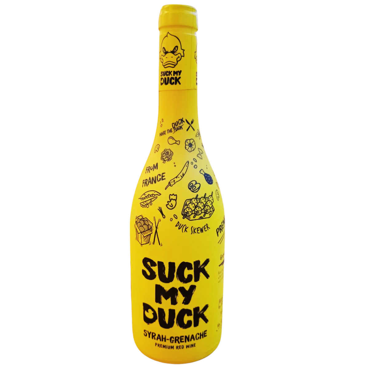 O vinho Suck My Duck da Vignobles Vellas é um tinto premium, descrito como ousado e moderno, que "chegou para quebrar as regras" do vinho tradicional.
